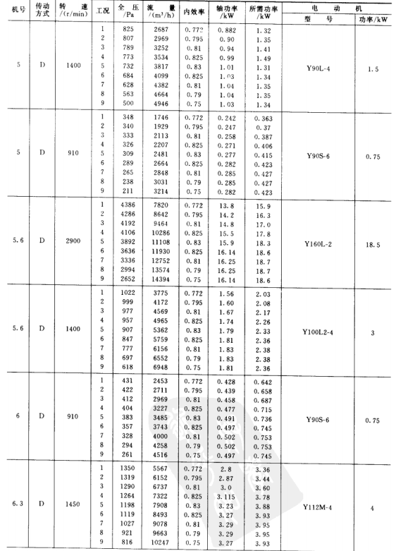 1)本風(fēng)機(jī)為單吸入風(fēng)機(jī),機(jī)號有No.3.15、3.55、4、4.5、5、5.6、6.3、7.1、8、9、10、11.2、12.5、14等共14個機(jī)號組成。