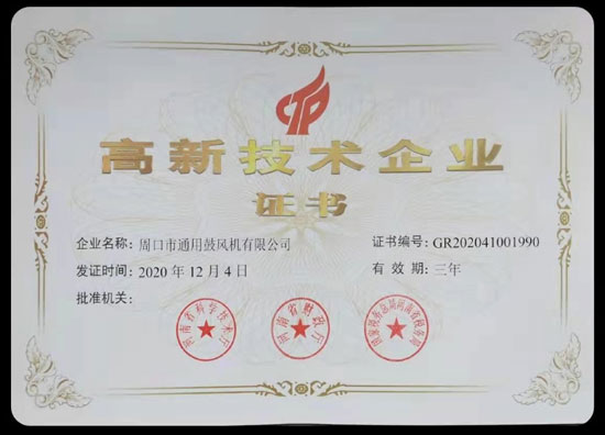 2020年12月4日,經(jīng)國(guó)家稅務(wù)總局河南省稅務(wù)局、河南省財(cái)政廳、河南省科學(xué)技術(shù)廳認(rèn)真評(píng)審,周口市通用鼓風(fēng)機(jī)有限公司順利榮獲“高新技術(shù)企業(yè)”證書。這是政府及社會(huì)各界對(duì)公司的認(rèn)可,我們將以此為動(dòng)力,努力的打造"周口風(fēng)機(jī)”品牌,生產(chǎn)出更好的產(chǎn)品來(lái)回饋客戶!