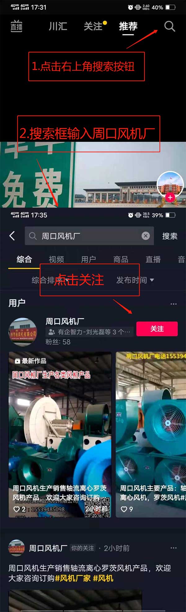 方法二:打開抖音APP,在右上角搜索欄輸入:周口風機廠,或者輸入抖音號:97903992377。